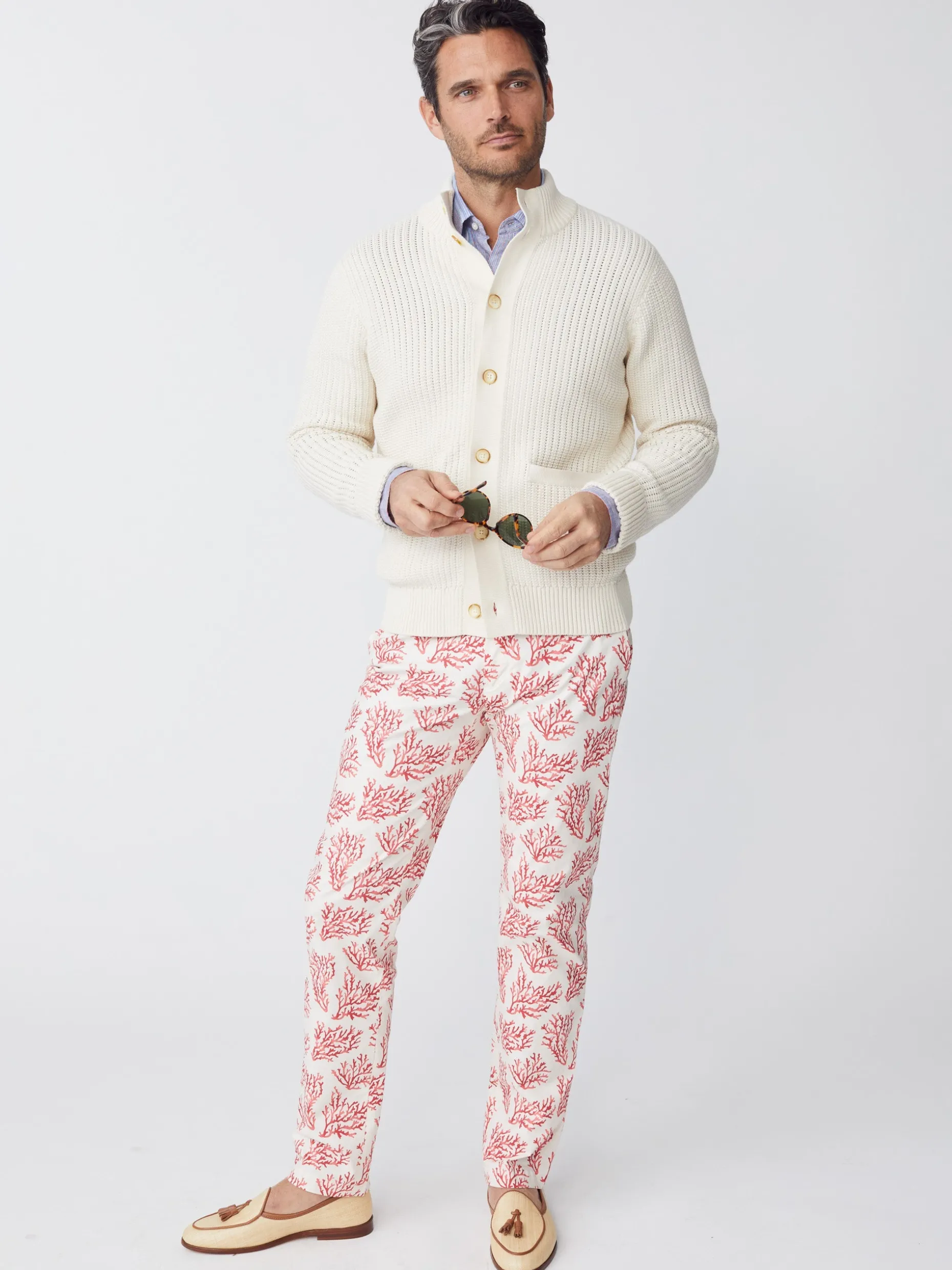 A great house sweater with poolside swagger, this beautifully knit cable cardigan can be worn year-round. Made in Peru, of unbeatable Peruvian pima cotton, it’s a richly comfortable take on seafaring tradition. Mock neck. Full placket.