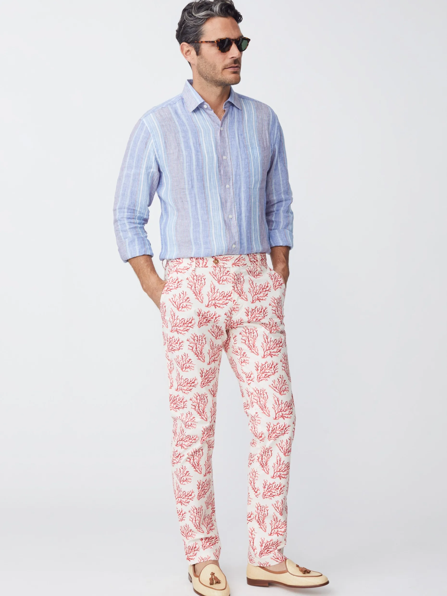 With a breezy white linen shirt, our boldly printed stretch cotton pants make quite the power move.