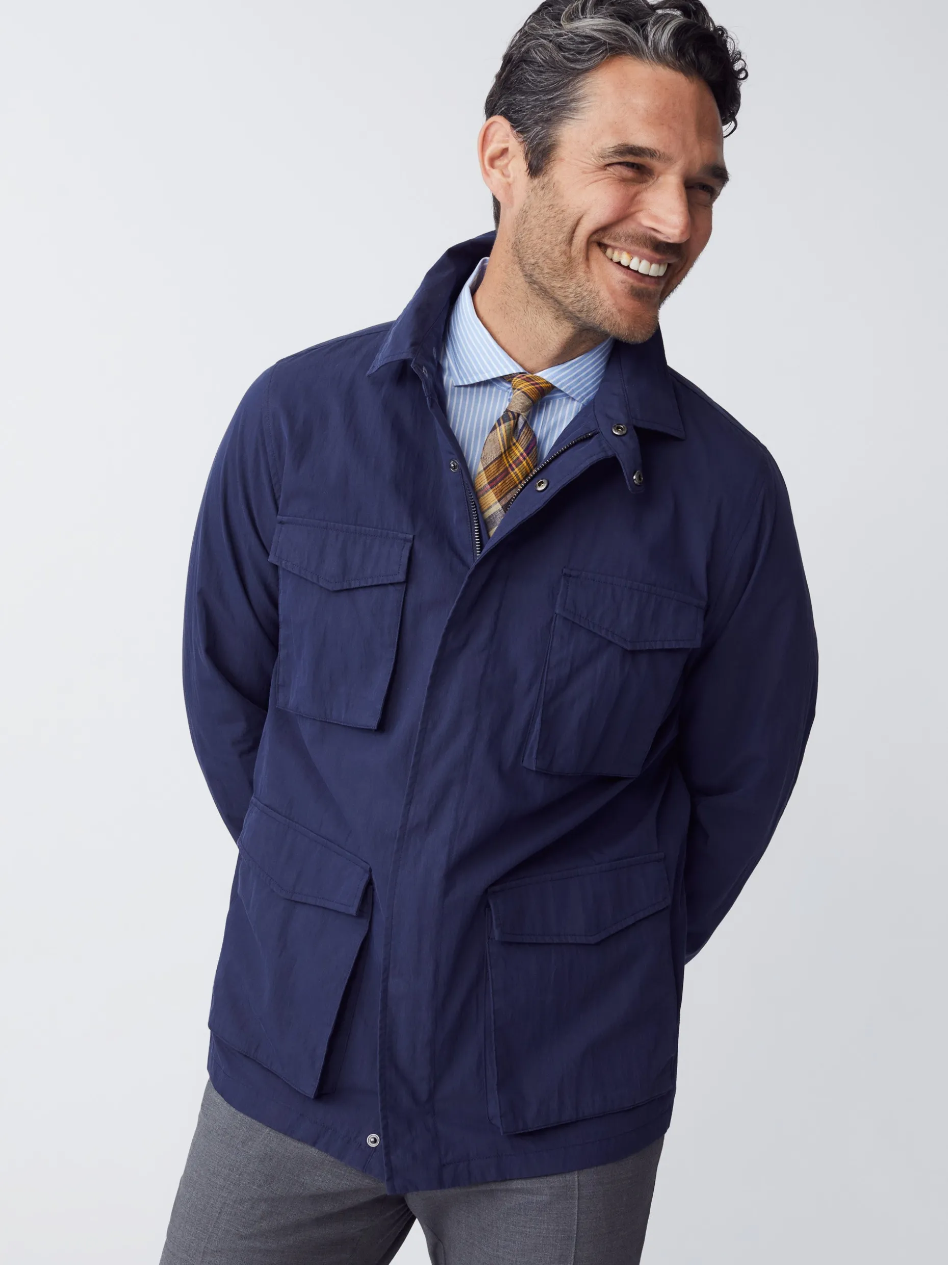 A lightweight spring layer that works in both rugged and refined scenarios. Think of it as a windbreaker upgrade, or the adventurer’s alternative to a sport coat. Travel friendly. Interior gold trim, zig zag collar stitching.