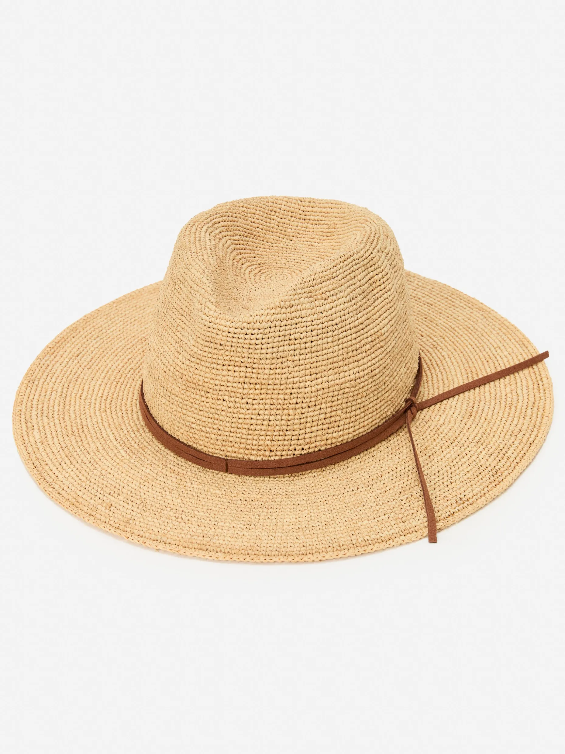 Our open weave straw hat makes the perfect beach companion. This one has brown suede trim that makes it stand out from the rest.
