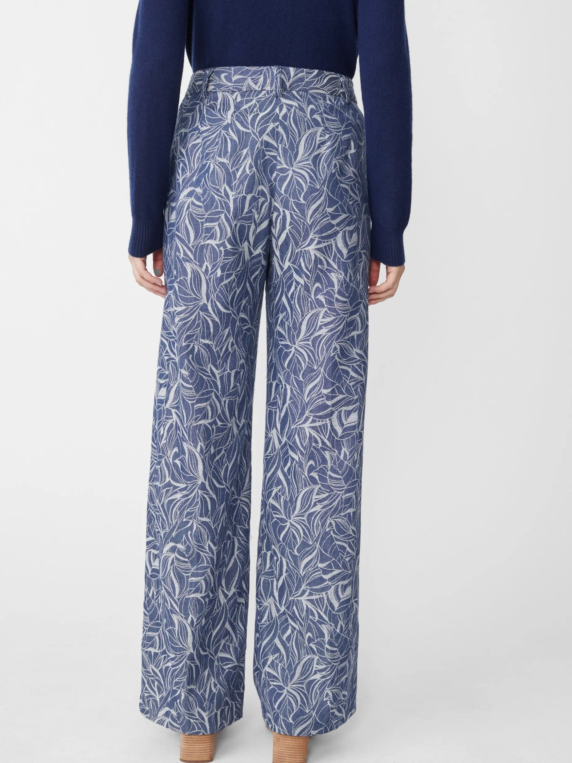 We’re all about the wide-leg silhouette this season. Our Morgan pant has slash pockets and an unexpected indigo printed leaf pattern.