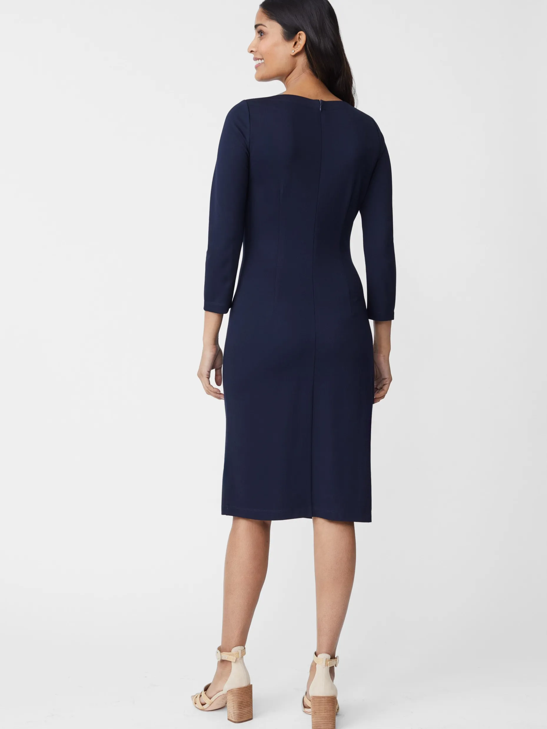 Crafted in our refined Bainbridge blend, the Sarra dress is a contemporary classic. Side ruched detailing adds a modern edge while the high boat neck lends a timeless feel.