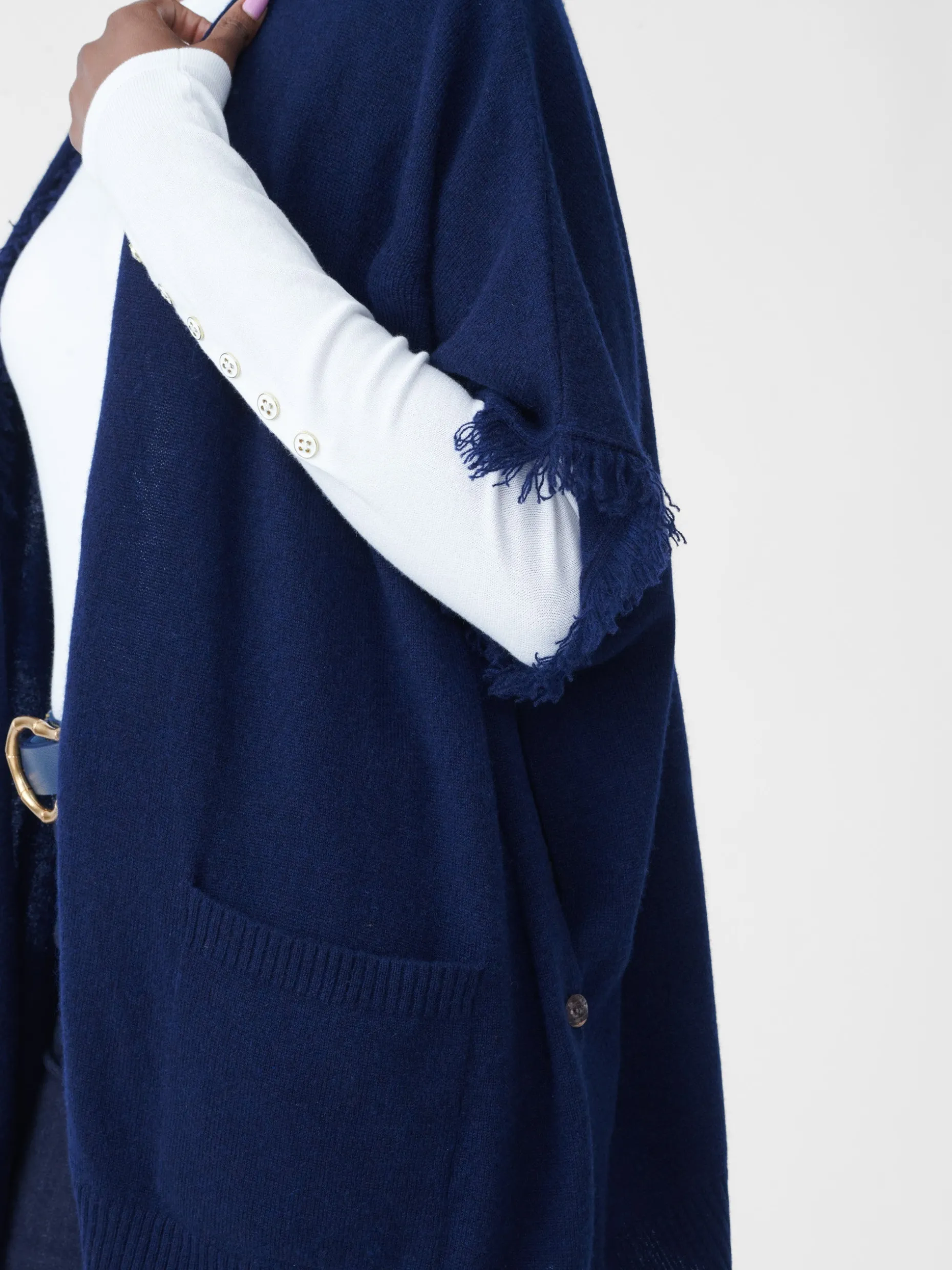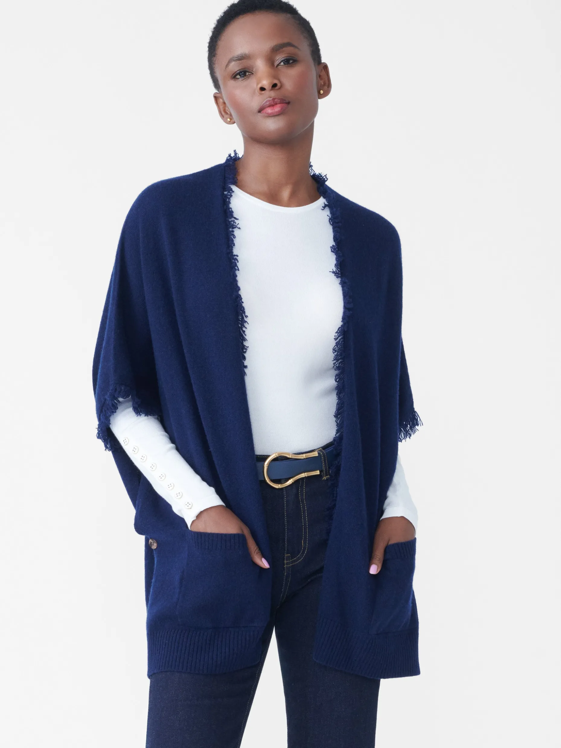 Wrapped and ready, our newest cashmere wrap comes with fringed edges and pockets.