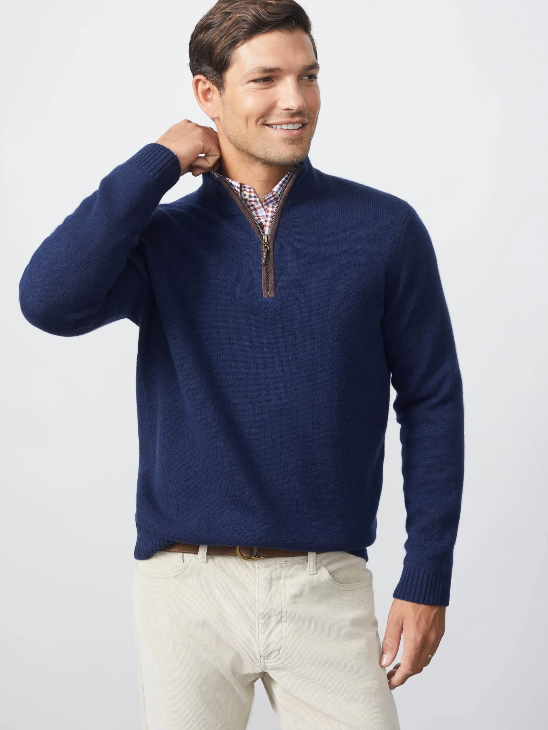 There is a reason why cashmere is often referred to as spun gold. It is just that luxurious and just that enduring. Add to that a classic half-zip silhouette detailed with rich suede and you have modern elegance at its nonchalant best.