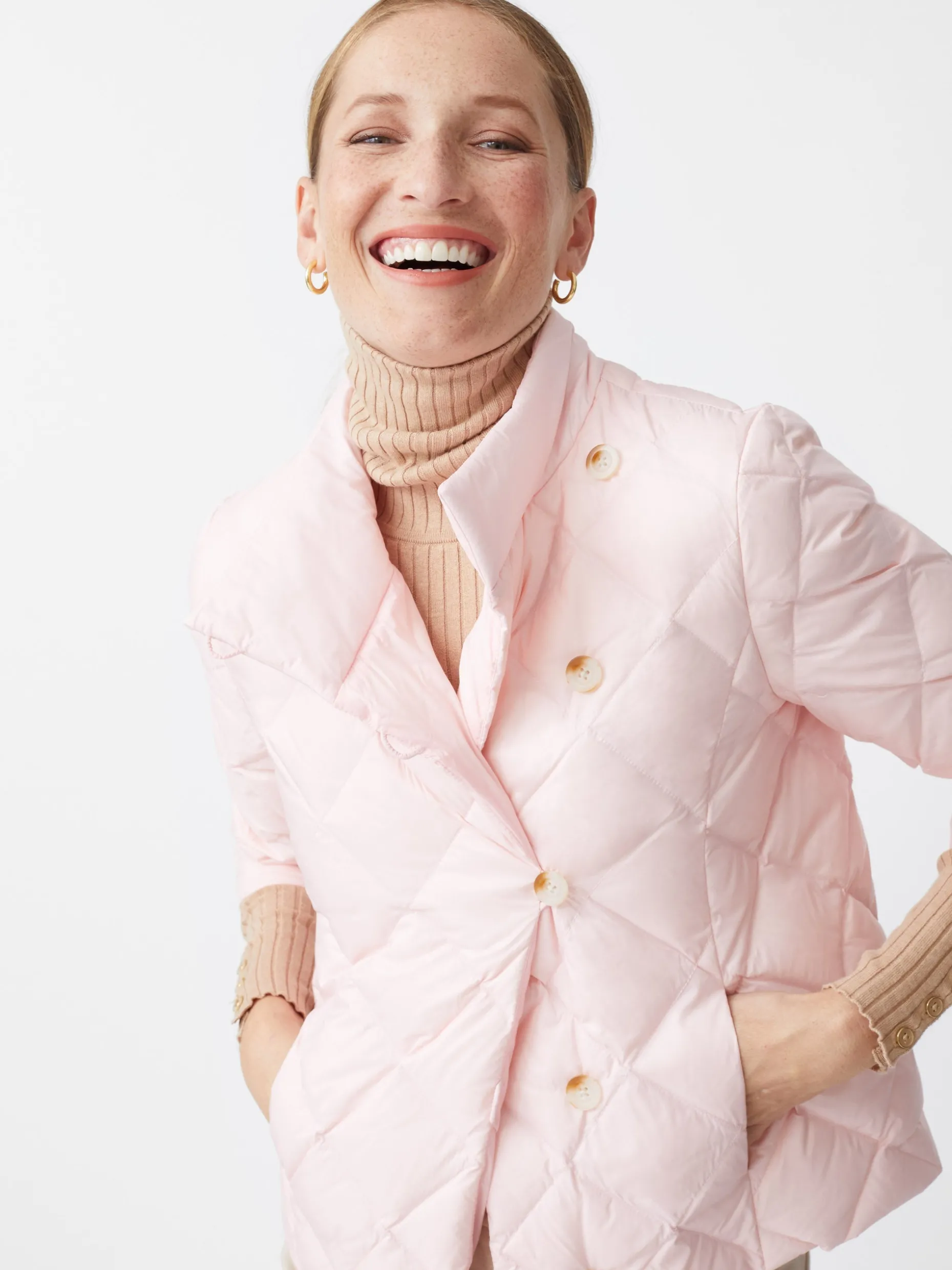 There’s Sarabeth and Camden and now there’s Vivian. Introducing: our newest puffer. With a 3/4 length sleeve, pockets, and quilted front, the Vivian is like the others but with a more modern feminine twist. The neck sits just above the collarbone to keep in the heat on cold winter days and the tortoise buttons sit just off-center for an unexpected layer of chic.