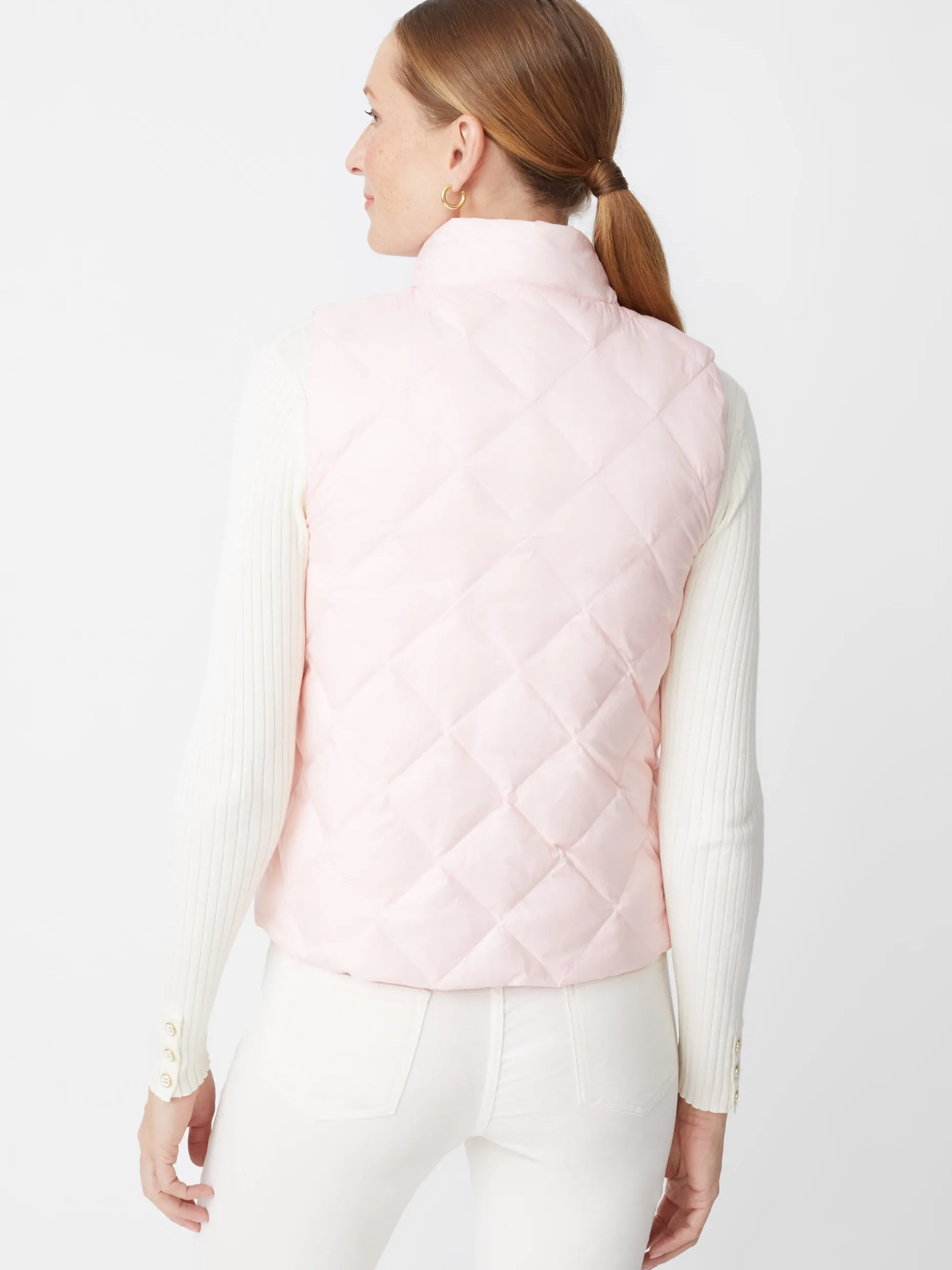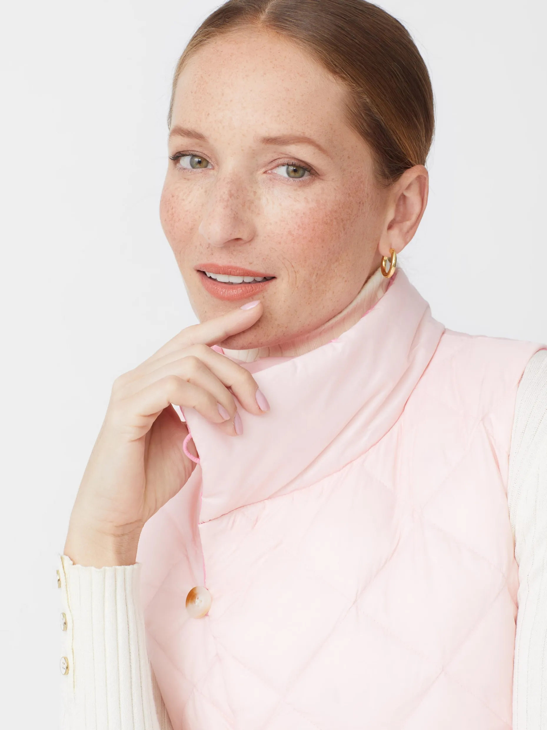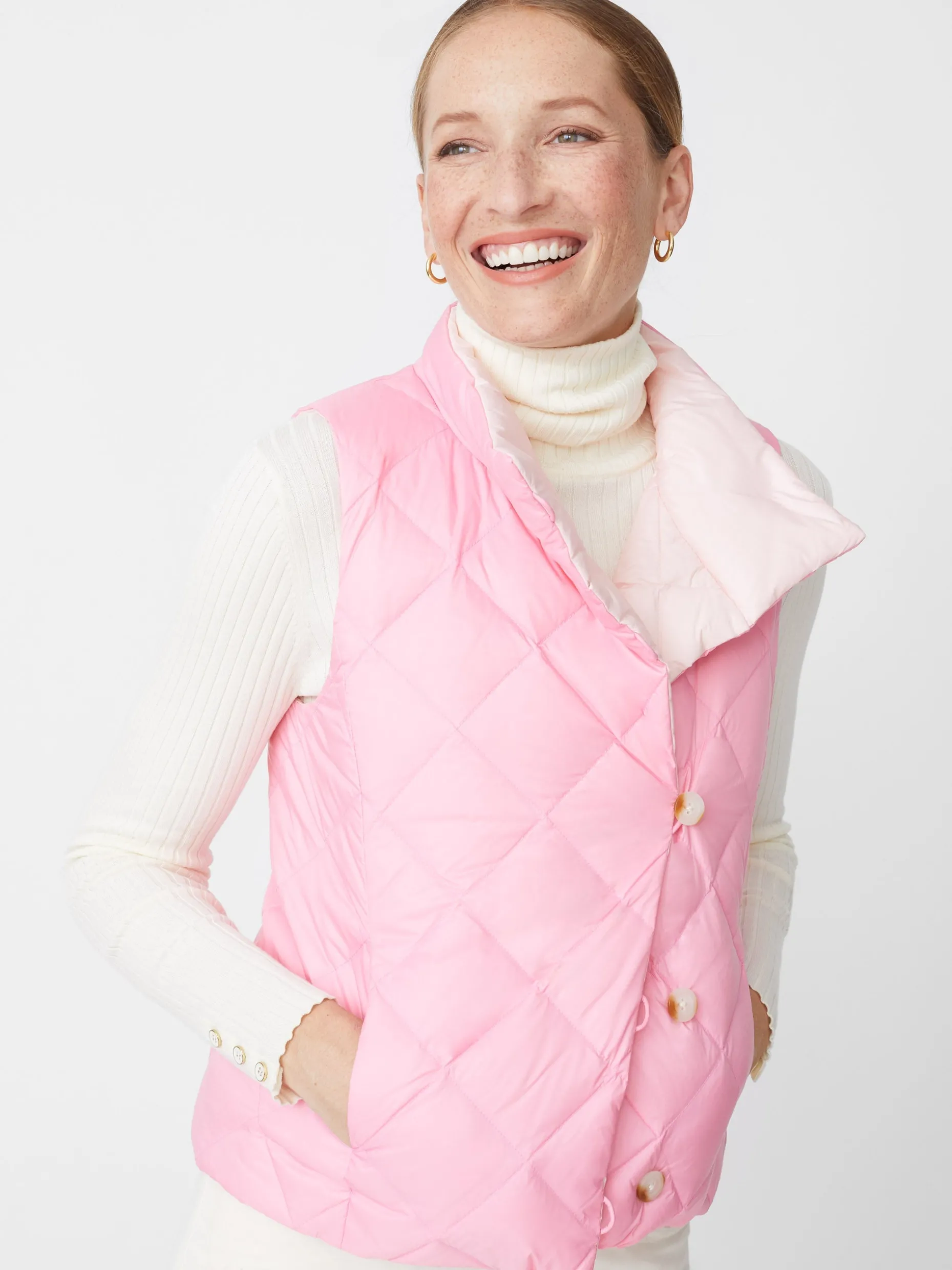 The Vivian quilted vest, a modern and infinitely versatile twist on our best-selling Vivian jacket. Layer up in unexpected elegance with off-center tortoise buttons and a neckline that sits just above the collarbone.