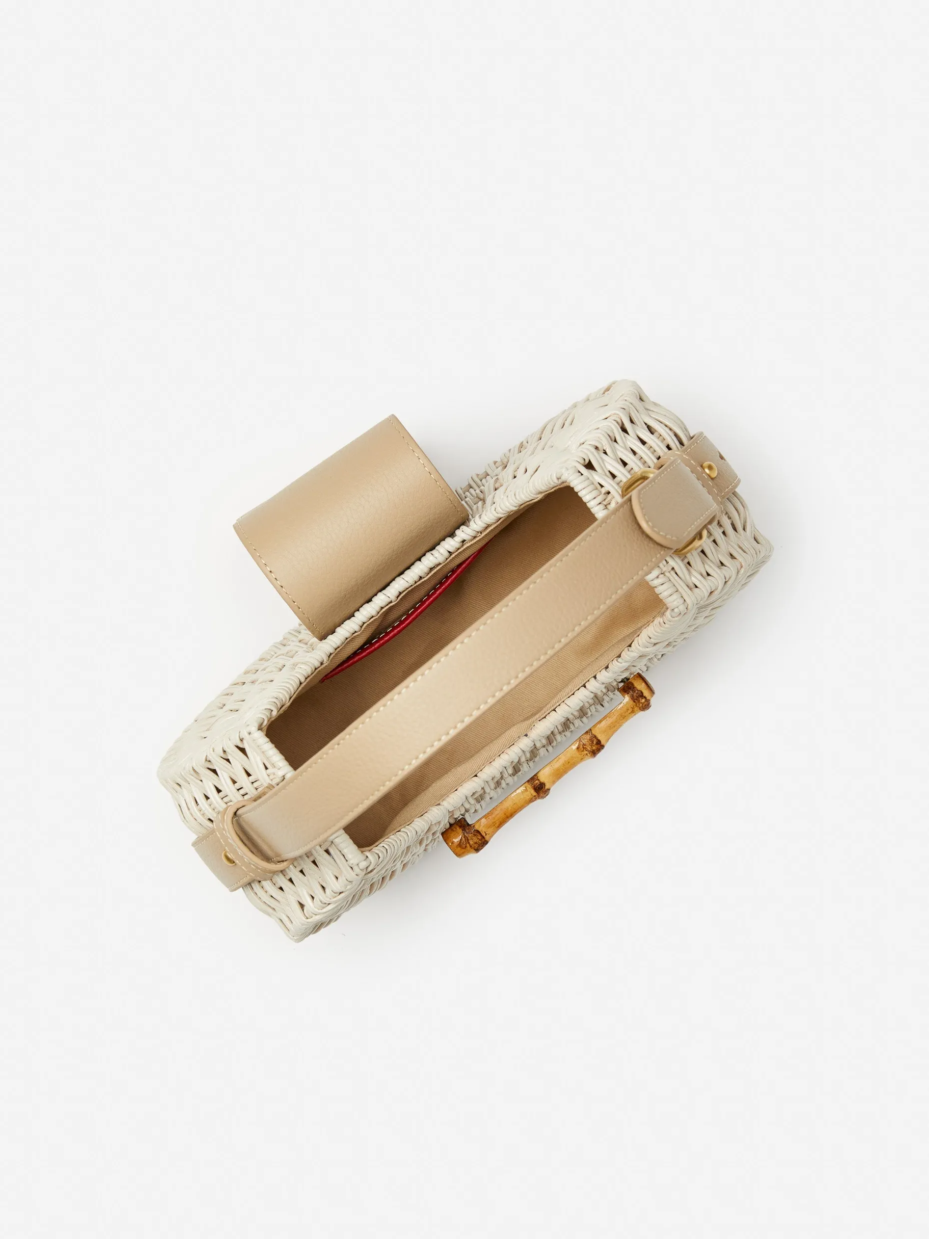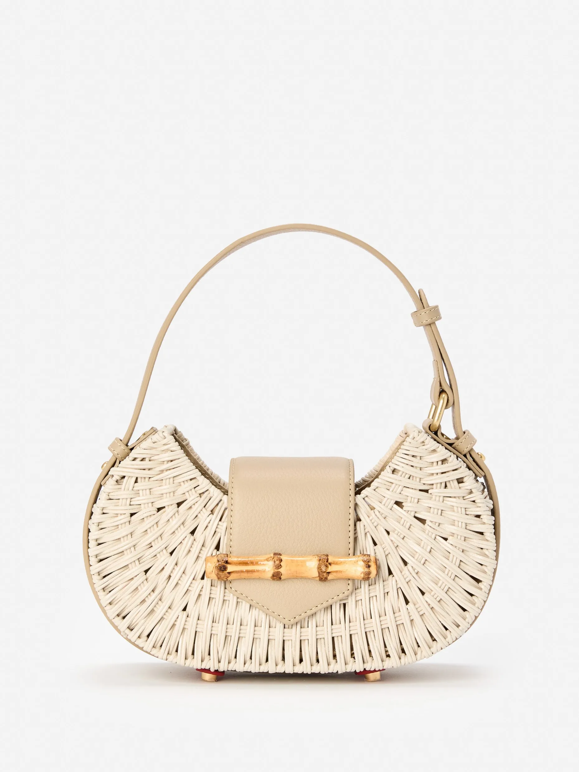 This wicker and pebble grain leather bag fits perfectly on your shoulder. Stash your sunnies, wallet, phone, and keys inside and clasp it closed with its bamboo buckle.